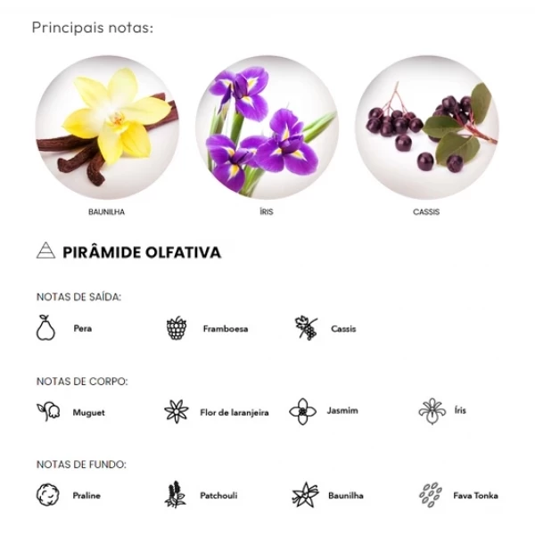 A nota de íris, um dos ingredientes principais desta composição, é envolta pelas flores de laranjeira e jasmim, que se mesclam com frutas suculentas. Em seguida a baunilha e o praliné formam uma aura gourmand, nos permitindo sentir um momento de alegria e prazer nas pequenas coisas.